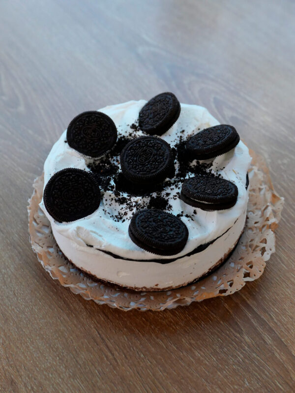 Una deliciosa tarta con base de galleta Oreo crujiente, relleno cremoso de queso con trozos de Oreo y una cobertura de galletas trituradas. Perfecta para los amantes de Oreo y para cualquier ocasión.