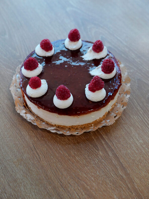 Una deliciosa tarta con base de galleta crujiente, relleno cremoso de queso y una capa de frambuesa fresca que aporta el equilibrio perfecto entre dulce y ácido. Ideal para cualquier ocasión.